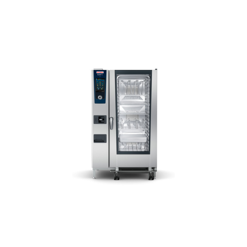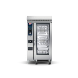 Four mixte gaz de 20 enfournements longitudinaux pour accessoires GN 2/1 à générateur de vapeur. Système de cuisson intelligent, pouvant être mis en réseau avec les modes de cuisson Volailles, Viandes, Poissons, Produits à base d’oeufs / Dessert, Garnitures / Légumes, Produits de boulangerie et Finishing et les procédés de cuisson Sauter, Pocher, Cuisson de produits de boulangerie et Griller.