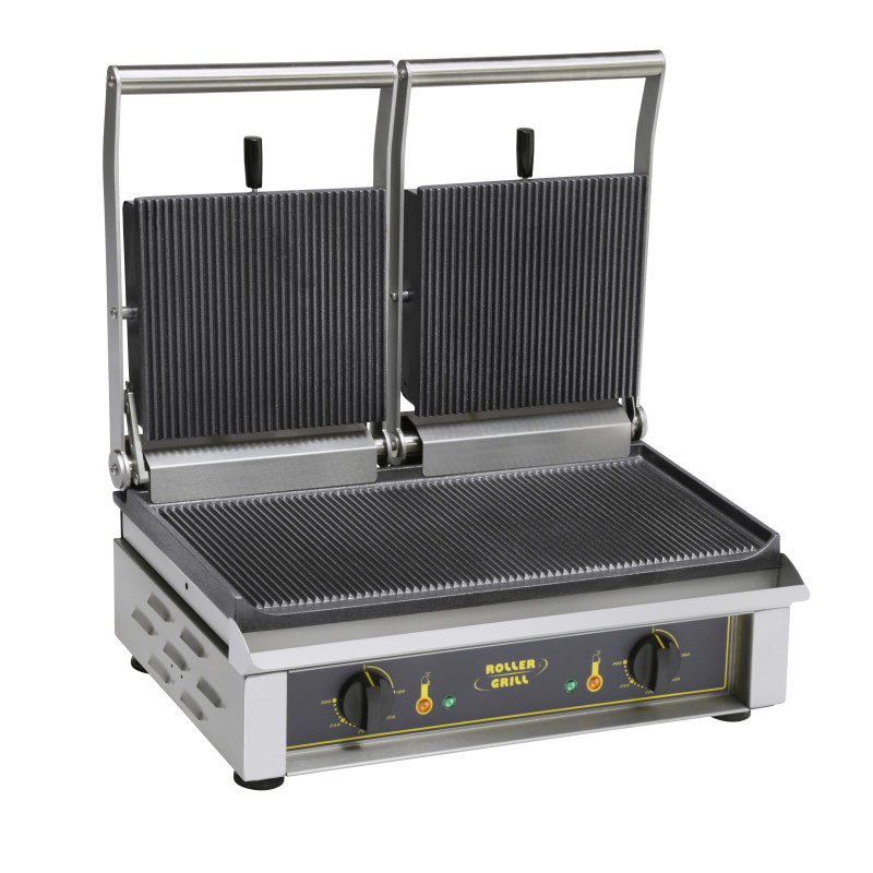 2 plaques supérieures et 1 grande plaque inférieure avec commandes indépendantes. Plaques en fonte à forte valeur de conduction et résistances en serpentin sous chaque plaque pour une cuisson homogène. Plaques supérieures auto-balancées et ressort de pression réglable. Équipement : thermostat de régulation 0-300°C, ramasse-jus, poignées thermorésistantes, interrupteur marche/arrêt, voyants. Livré avec grattoir. Plaques rainurées haut et bas