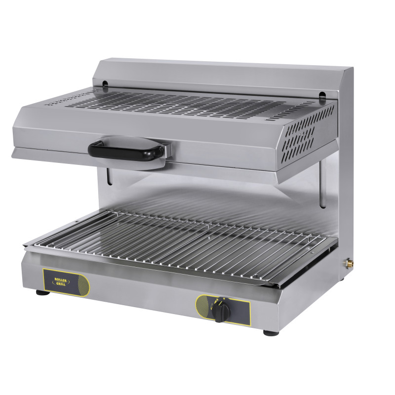 Salamandre à toit mobile, gaz forte puissance, pour la saisie et le glaçage des plats sans préchauffage. Double brûleurs infrarouges (largeur = 60 mm) et thermocouple de sécurité. 700 à 800°C selon le gaz utilisé. Surface de cuisson: 740 x 375 mm. 3 zones de chauffe indépendantes, plat inférieur amovible avec grille, support mural (SM 2) en option. Livré en butane/propane. Pochette d injecteurs pour GN.