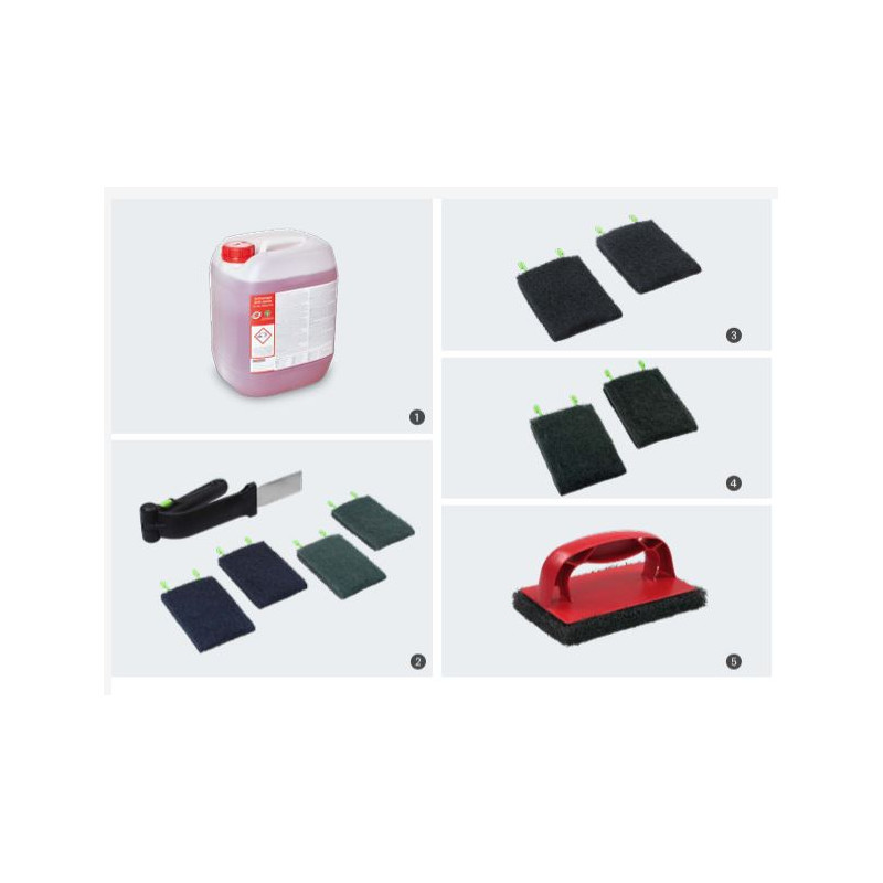 Kit de nettoyage Comprend 10 l de nettoyant pour grill, 1 bras de nettoyage, 2 tampons de nettoyage durs, 2 tampons de nettoyage doux, 1 éponge de nettoyage.