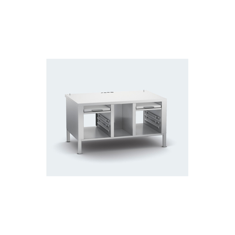 2 tablettes coulissantes, 6 paires de rails de support 1/1 GN (325 × 530 mm). Parois latérales et dessus fermés, panneau arrière ouvert. 4 pieds en acier inoxydable avec dispositif de fixation (non réglables)