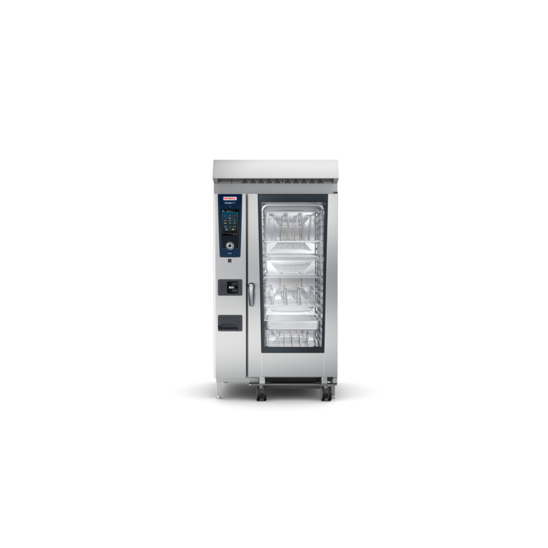 Four mixte électrique de 20 enfournements longitudinaux pour accessoires GN 2/1 à générateur de vapeur. Système de cuisson intelligent, pouvant être mis en réseau avec les modes de cuisson Volailles, Viandes, Poissons, Produits à base d’oeufs / Dessert, Garnitures / Légumes, Produits de boulangerie et Finishing et les procédés de cuisson Sauter, Pocher, Cuisson de produits de boulangerie et Griller.