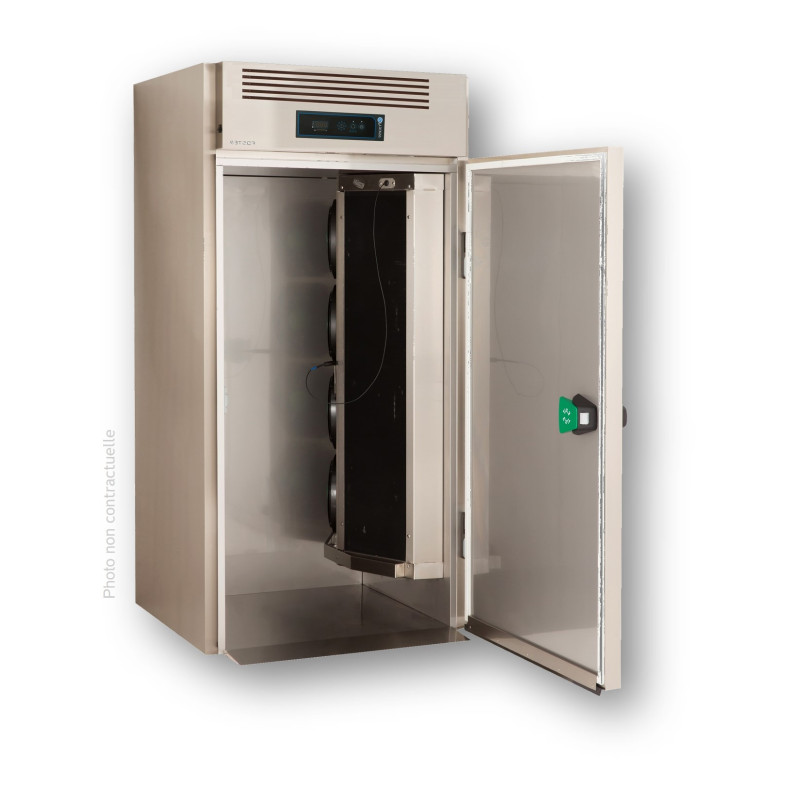 Cellule de refroidissement modulaire pour chariot de four GN1/1 à groupe logé - 80 kg par cycle (+63°C à +10°C en 90 min) Capacité : 1 échelle GN1/1, 600x400 ou chariot de four GN1/1 - 20 Niveaux max Mannequin évaporateur à droite (mannequin à gauche sur demande) Construction modulaire - Isolation haute densité HFO épaisseur 80 mm - Revêtement intérieur et extérieur Inox 304 - Sol inox isolé 17 mm d épaisseur avec rampe d accès amovible - Poignée avec serrure et décondamnation intérieure. Joints de portes fongicides demontables sans outils & balai racleur - Charnières renforcées à rappel et blocage à 90°. Puissance frigorifique 3320W à –15/+55°C - Evaporateur ventilé traité cataphorèse, suspendu, avec aillettes verticales - Moteur ventilateur evaporateur en ABS - Fluide frigorigène R449 - Dégivrage naturel-Pilotage automatique sonde ou minuterie. Dotation : 1 Echelle 20 niveaux + 10 grilles