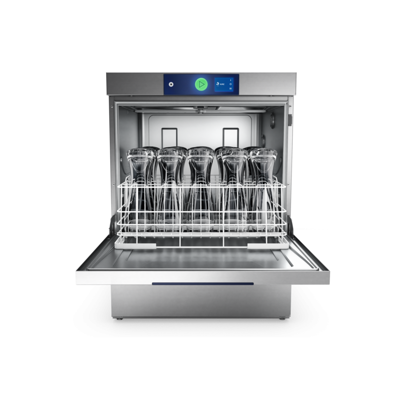 - Lave-verres à chargement frontal casiers 500 x 500 mm - Hauteur de passage 425 mm - Capacité jusqu'à 60 casiers/h ou 2 160 verres/h - Capacité avec double casiers jusqu’à 120 casiers/h - 6 cycles automatiques : Court, Standard, Intensif, Rinçage eau froide, Rénovation, Hygiène - Commutable de 400 V à 230 V sur site - Prêt à installer - équipement complet : tuyaux arrivée d'eau / vidange, câble d'alimentation (400 V), doseurs de détergent et rinçage, pompes de rinçage et de vidange, brise-vide - Construction acier inoxydable 1.4301 - Détecteur de présence de filtres - Détecteur de produits chimiques (en option) - Cycle d’auto-nettoyage final