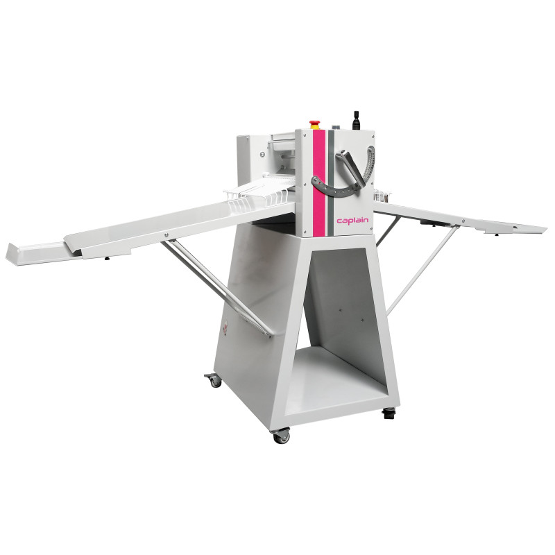 Laminoir sur socle à roulettes Largeur utile de travail : 490 mm Poids du pâton réfrigéré : 4 kg maximum Tables rabattables - Goulottes de récupération sur glissières - Bac à farine - Racleurs supérieurs démontables - Inversion de laminage par joystick - Grilles de protection - Rapidité et facilité de démontage des racleurs supérieurs