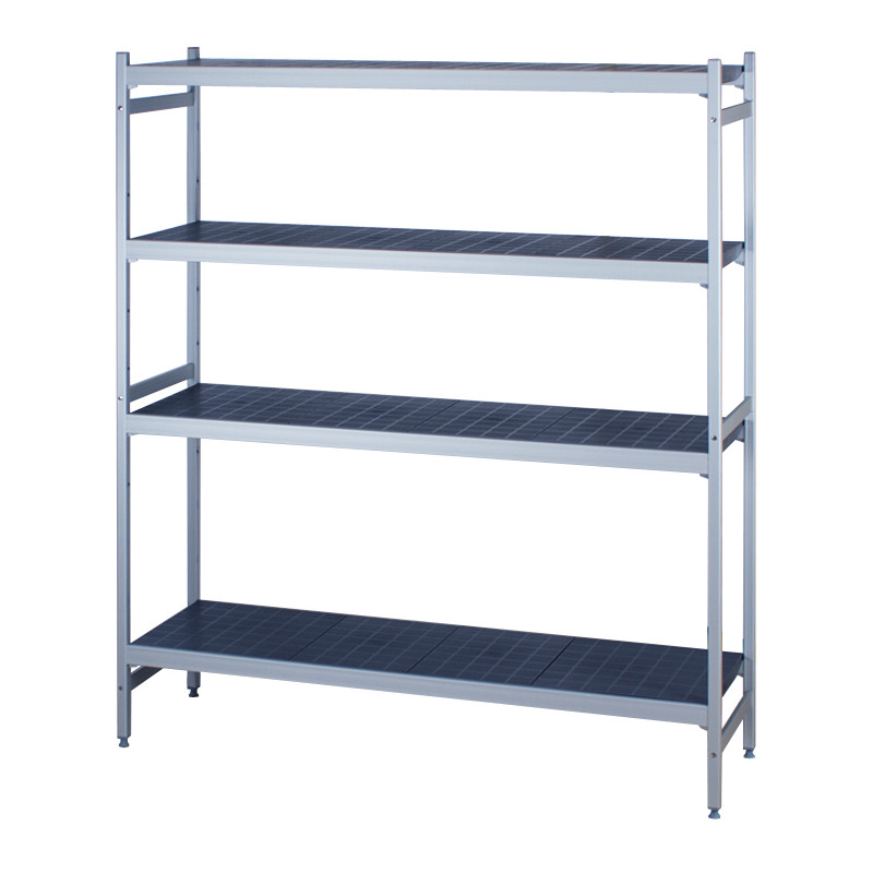 RAYONNAGE FERMOSTOCK 4 NIVEAUX 6622 Avec clayettes pleines amovibles en Polymère (lavables en machine). Structure Duralinox anodisée 20 microns. Montage rapide et sans outil. Réglage des niveaux à la hauteur désirée au pas de 150 mm. Vérins composite et visserie inox. Charge maximum : 200 Kg par niveau (uniformément répartie), 900 Kg entre 2 échelles et 600 kg pour chaque linéaire d’une configuration comprenant un ou plusieurs retours d’angles. Fabriqué en France Dim. L 957 P 560 H 2100