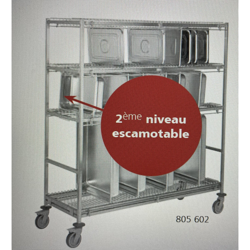 roues à chape polyamide pour égouttage et stockage desbacs, grilles et couvercles GN construction en inox structure tube inox 25 x 25 mmsoudée grilles amovibles en fils inoxdiam. 6 et 4 mm barres d arrêt escamotables 4 roues pivotantes diam. 125 mm dont 2 à freins bandage non marquant, pare-choc annulaires