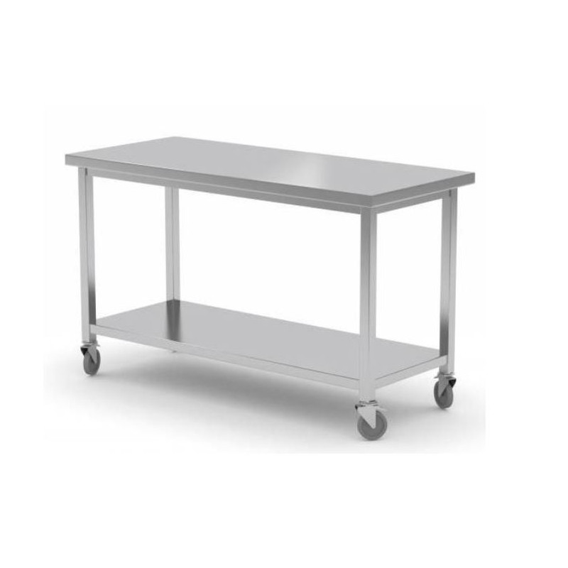 Table inox sur roues à chape inox diamètre 125 mm dont 2 à frein - plan de travail en inox épaisseur 15/10e mm - dessus doublé par panneau stratifié double face épaisseur 12 mm - bandeau avant rayonné avec bord écrasé anti-coupure - dosseret rayonné hauteur 100mm - certificat NF Hygiène alimentaire - 4 butoirs d angle
