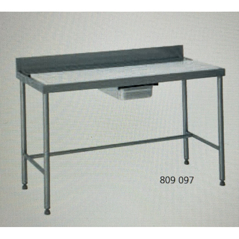 Table de dessouvidage dimensions 1500 x 700 x 900 mm - construction soudée inox - bords anti-ruissellement - dosseret porte-couteaux hauteur 100 mm - plaque de découpe polyéthylène 1435 x 400 mm et tôle perforée inox 1435 x 245 mm - fond pointe de diamant avec évacuation - bac inox de récupération des exsudats sur glissières - piétement tube inox diam.45mm avec vérins sans filetage apparent (fiche technique n° 10.149.0)
