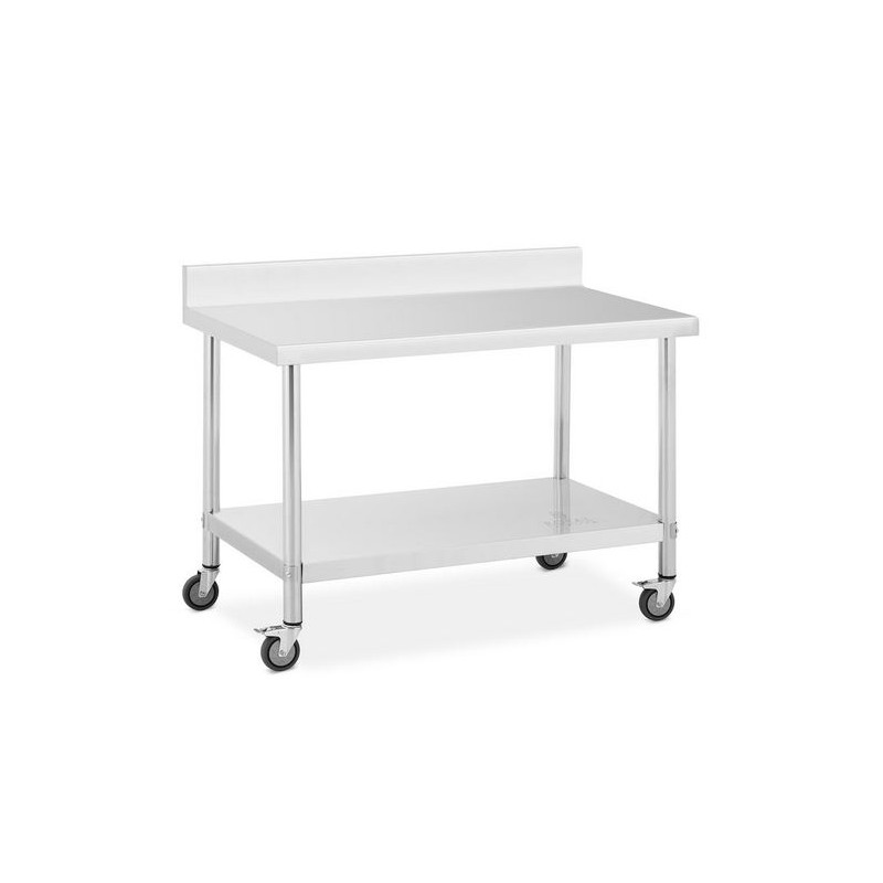 Table inox adossée avec étagere sur roues à chape inox diamètre 125 mm dont 2 à frein - plan de travail en inox épaisseur 15/10e mm - dessus doublé par panneau stratifié double face épaisseur 12 mm - bandeau avant rayonné avec bord écrasé anti-coupure - dosseret rayonné hauteur 100mm - certificat NF Hygiène alimentaire - 4 butoirs d angle