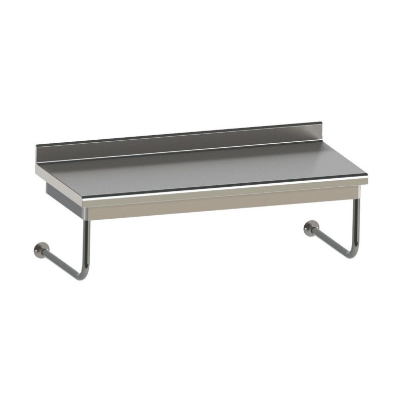 Table inox adossée suspendue sur mesure longueur de 601 à 1000 mm largeur 700 mm - plan de travail en inox épaisseur 15/10e mm - dessus doublé par panneau stratifié double face épaisseur 12 mm - bandeau avant rayonné avec bord écrasé anti-coupure - dosseret rayonné hauteur 100mm - fixation par supports muraux sous le dosseret et consoles tube diam. 42 mm avec vérin de réglage de l horizontalité