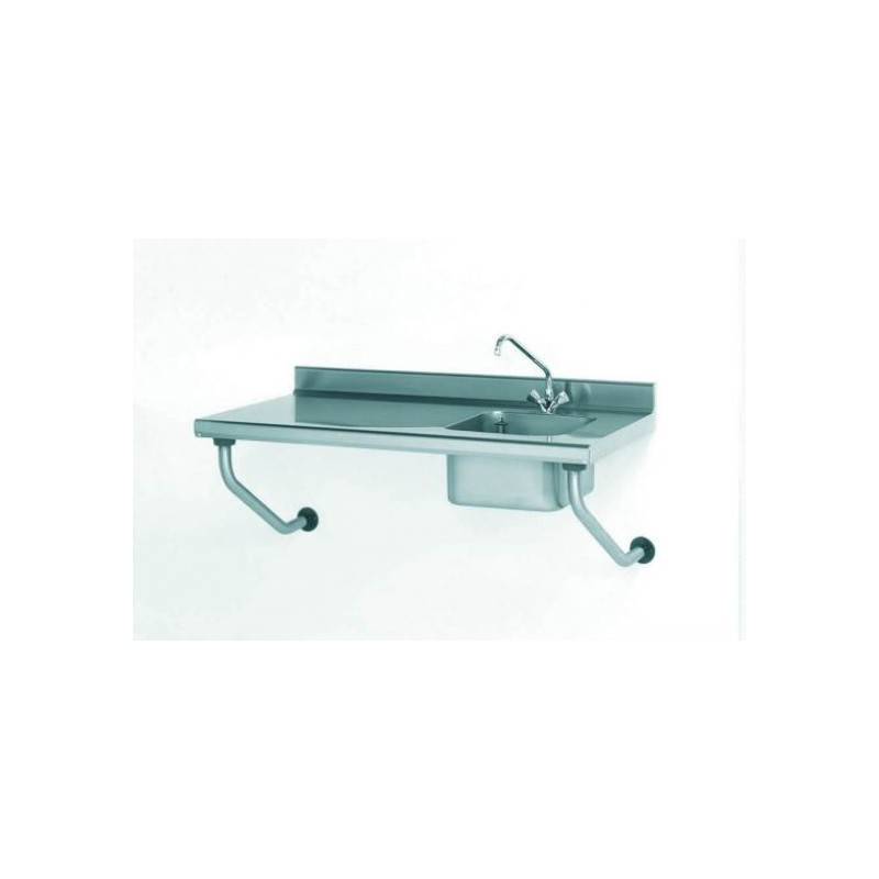Table inox du chef adossée suspendue bac à droite sans robinetterie, avec perçage diamètre 33 mm dimensions 1200 x 700 mm - plan de travail en inox épaisseur 15/10e mm - dessus doublé par panneau stratifié double face épaisseur 12 mm - bandeau avant rayonné avec bord écrasé anti-coupure - dosseret rayonné hauteur 100mm - bac 400 x 400 x 250 mm avec tube surverse - fixation par supports muraux sous le dosseret et consoles tube diamètre 42 mm avec vérin de réglage de l horizontalité - livraison à plat sous carton