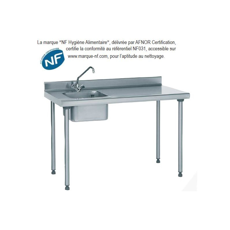 Table inox du chef adossée bac à droite, avec étagère inférieure fixe sans robinetterie, avec perçage diamètre 33 mm dimensions 1000 x 700 mm hauteur 900 mm - plan de travail en inox épaisseur 15/10e mm - dessus doublé par panneau stratifié double face épaisseur 12 mm - bandeau avant rayonné avec bord écrasé anti-coupure - dosseret rayonné haut.100 mm - bac dim. 400 x 400 x 250 mm avec tube surverse - piétement tube inox diam.45mm en retrait de 65 mm à l arrière vérins anti-glissement sans filetage apparent - livraison à plat sous carton